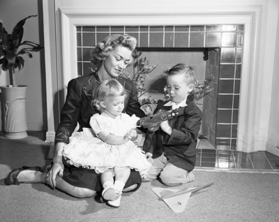Mrs. Robert Widmer, 3813 Arundel, shown here with her two children, Gail, 2, and Larry, 5, has been elected chairman of the Creative Arts Section of Junior Woman's Club. Mrs. Widmer's painting of a scene from a window in a Dayton, Ohio, hotel won first prize at the section's recent art show.