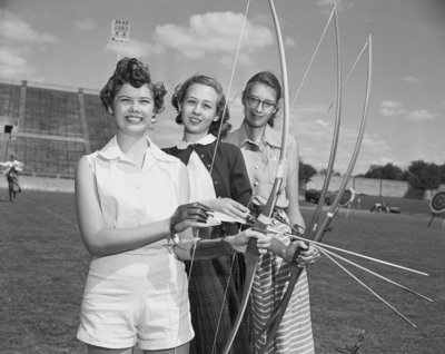 This trio took top honors in the senior high school girls archery tournament Monday. Poly's Cynthia Secrest, left, was first; Arlington Heights' Margaret Bedford, center, second and North Side's Jean Pierce third. Poly won team title.