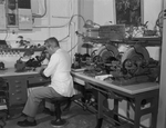 Mr. I. B. Cox, a shop manager for Shur-Fit Optical Company, is shown at work with a lensometer in the firm's remodeled shop, which was equipped with the latest precision instruments of the time. Published in the morning edition, April 23, 1950.