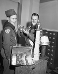 Approximately 100 items made from tin cans will be displayed by members of Troop 38 at the Boy Scout Exposition beginning at 6:30 p. m. Friday and Saturday nights in the Exposition Building of Will Rogers Memorial Auditorium and Coliseum. Two troop members, Richard Woolheater, left, and Troy Chapman are shown with an ash tray, lamps and a reflector oven made by the scouts.