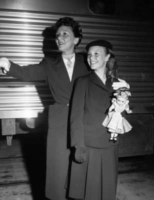 Heller Halliday, 11, and her mother, Mary Martin of stage fame, were greeted by 30 or more friends and relatives at the Santa Fe Station Tuesday when they arrived from a European stay of two years. Mary is the star of "South Pacific," the remarkably enduring musical.