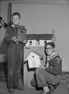 Members of Cub Pack 2 will be hard at work building bird houses Friday and Saturday night during a demonstration of the craft at the Boy Scout Exposition. Here Pack members Thomas Gabbert, left, and Reed Washmon are shown with three houses the boys have built. The show will open at 6:30 p. m. daily in the Exposition Building of Will Rogers Memorial Auditorium and Coliseum.