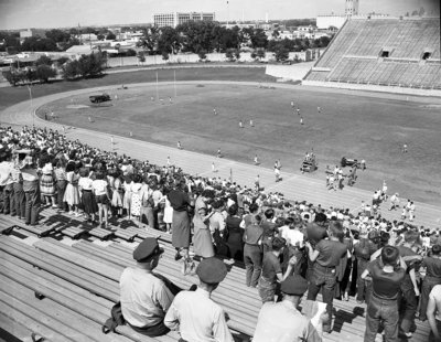 Spectators stand to watch boys in relays at Farrington Field. An estimated of 6,000 grade school particicpants competed in the annual affair. about 5,000 fans watched.