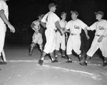 Russ Rose, left, gives large welcome to Vic Marasco after Cat outfielder's two-run homer in second inning Wednesday night. Batboy is Bill Hunter of Carter Riverside High School. Cats beat Exporters, 12-3.