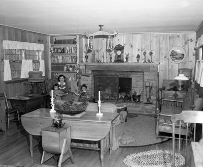 Mrs. Campbell in her living room with Melinda, 4, and Melissa, 2 and a half.