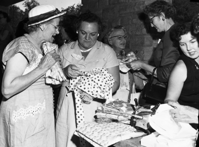 Mrs. J. A. Bursey of 5432 Birchman Avenue, left, trades remnants with Mrs. E. J. Mooneyham of Bloodworth during the annual Tarrant County home demonstration club "swap day" Thursday at Rockwood Park.