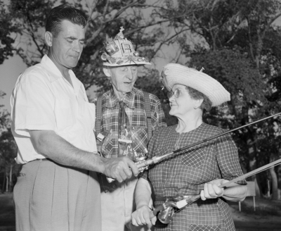 Andy Davis, left, president of Cowtown Casting Club, gives pointers on bait casting to Bill Dougherty and Mrs. Bessie Green. Their fancy hats indicate the gay spirit that pervaded the two-day camp at Young Men’s Christian Association (YMCA) Camp Carter. Ninety men and women past 60 joined in the Golden Age festivities.