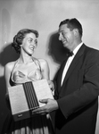 Duane Sears, owners and manager of Duane's shoes at Houston and 6th, shows Miss Wilda McJunkins, Texas Christian University (TCU) student, one of the overnight bags he will present every woman customer Saturday, the store's opening day.