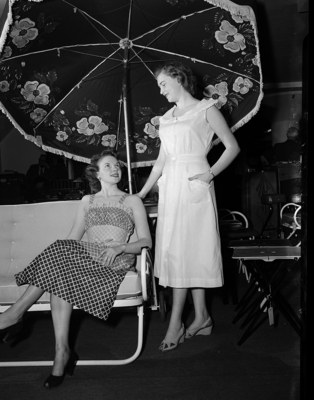 Frances Milan, seated is wearing a gray and white check sundress which has a matching bolero. Martha Bradford, standing, wears a yellow pique dress with white eyelet trim. Published in Fort Worth Star-Telegram morning edition May 7, 1950.
