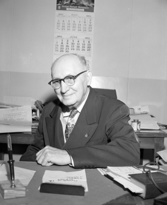 Portrait of Horace H. Fox, a retiring credit manager shown seated at desk.