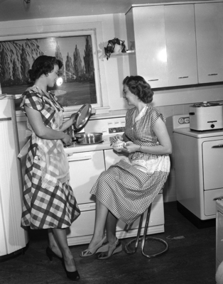 Left is a lady in a gray and white plaid cotton housedress with silver button trim and right is another young lady in a lavender and white check cotton with eyelet embroidery inset. Published in Fort Worth Star-Telegram evening edition May 7, 1950.
