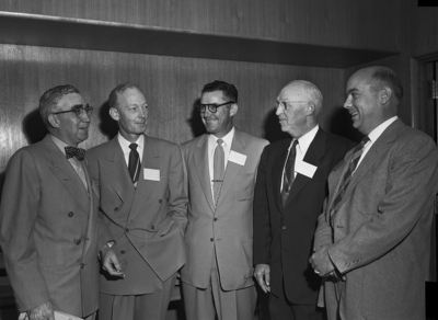 Among 100 cedit men from banks across Texas meeting at the Continental National Bank Friday were, left to right, Claud Vaughn, H. A. Pendleton Junior and Ed Fizer, all vice presidents at Wichita Falls banks; W. B. Duke, vice president of the Fort Worth National Bank, and Frank Storm Junior, Amarillo bank vice president.