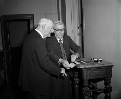 C. Roy Gaines, president of Gaines Cadillac, Incorporated, left, is fingerprinted in Dallas by United States (U. S.) Deputy Marshal Charles W. Young after being assessed a fine of $70,000 and a probated prison sentence for income tax evasions totaling $130,646.96.