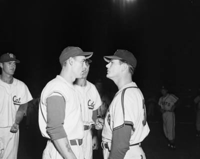 Al Ronning, left, Cat catcher who was on bench Saturday night, tells Sports Manager Mickey Livingston he was bean ball target Friday.