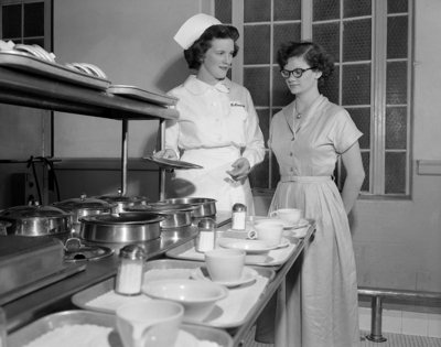 Assembly line operations are necessary to turn out hundreds of food trays for each meal. Miss Catherine Crouse, senior from Pittsburgh, Pennsylvania, guides Margie through the kitchen.