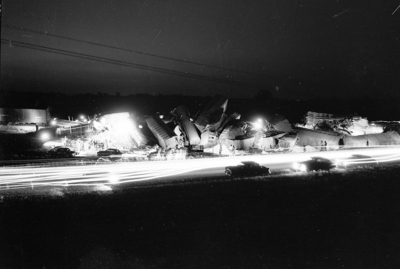 This is the scene of twisted wreckage where a Texas & Pacific freight train plunged down an embankment late Saturday near Roanoke.