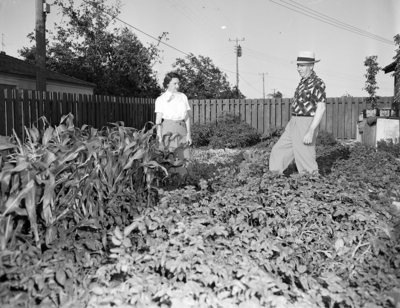 This backyard garden of the V. G. Griffing was formerly a rocky hill. The Griffing family built the soil from a compost box and already is eating many vegetables including tomatoes. In this picture Mr. and Mrs. Griffing are enjoying the garden.