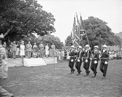 Platform guests and families of Arlington State College students watch ROTC members march during a special Mother's Day program. Left to right on the platform are Maj. Eldon L. Ballinger, Miss Shirley Cannon of Grapevine, Mrs. E. H. Hereford and President Hereford, Mrs. C. Lenwood Moore of Dallas, Oscar Gray Jr. of Arlington, and Mrs. S. J. Hopper and Dean Hopper.