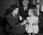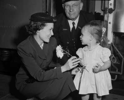 Three-year-old Lynn Coleman offers her mother, Mrs. T. J. Coleman of 4108 Trail Lake Drive, a carnation. The flower was given to the little girl by Burlington Conductor E. Woodcock of Dallas. Burlington Lines presented carnations Sunday to each woman passenger as a special Mother's Day gift. Doctor and Mrs. Coleman left Fort Worth to attend a medical convention at Amerillo.