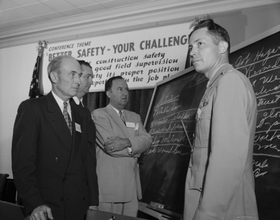 Colonel H. R. Hallock, right, Fort Worth district Army engineer, analyzes cause of lost-time accidents at safety conference Monday at Hotel Texas. Looking on, left to right, are J. D. Wheeler, compensation chief, Board of Insurance Commisioners, Austin; R. M. Smith of McKenzie Construction Company, San Antonio, and R. M. Dixon of Associated General Contractors chapter at Dallas.