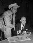 Sheriff Harlon Wright, left, of Fort Worth and Sheriff William M. Lennox of Philadelphia discuss the protocol by which one sheriff deputizes another sheriff. Sheriff Wright was among those who welcomed the Pennsylvania officer, a supreme director of the Knights of Columbus, to the opening activities of the Texas state K. C. convention here Monday.