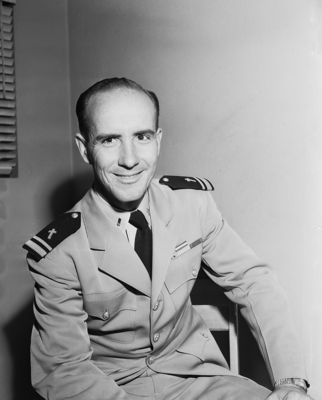 In the picture is Chaplain Billy Nelson Wolfe. He is wearing his military uniform and sitting on a chair.