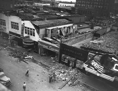 This is Austin St. in Waco. The photo shows the shattering effects of the tornado on structures extending left from the demolished six-story R. T. Dennis Furniture Company building just out of view to the right. At least two people were killed in Chris' Café, and a number injured in the Joy Theater next door.