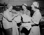 Mrs. E. J. O'Bryan, left, was overjoyed when Red Cross gave her fresh, warm clothing after the devastating tornado took all she had. Disaster workers with her are Mrs. J. R. Salmon, center, and Mrs. Scott Snodgrass, both of San Angelo.