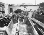 Goodfella Air Force Base enlisted men salvage pews from the ruins of Lakeview Baptist Church, partly destroyed by the San Angelo twister. The wall at rear was the only stable thing left in the place.