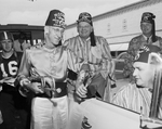 John Bevil, left, marched with Art Ford, right, in the Moslah Temple Shrine parade since 1920. The image shows Mr. Bevil jokingly trying to tickle the arthritis from Mr. Ford's feet, so he can march alongside his friend. Though the tickle did not work, Mr. Ford, drum major for the Moslah Drum and Bugle Corps, was still able to ride a convertible to keep intact a 29-year record of never missing a parade. Published in the morning edition April 23, 1950.