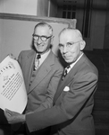 George Conner, right, former president of the Board of Education, displays the scroll given to him Wednesday night by the board. O. C. Armstrong, who succeeded Conner as president, presented the tribute, signed by all members, during a dinner at the Administration building.