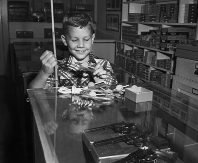 Eight-year-old Eric (Rick) Borger has a tough decision to make. He's got to pick just the right fishing equipment to make sure that the big one does not get away during the annual Boys and Girls Better Fishing Rodeo Saturday at White Lake. He is the son of Mr. and Mrs. Edwin Borger of 551 South Lake.