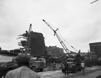 This huge section of floor in the R. T. Dennis Furniture store at 5th and Austin in Waco is lifted off first-floor debris in the Waco tornado area. Several bodies were recovered under this section of floor which had to be ripped by portable power saws.
