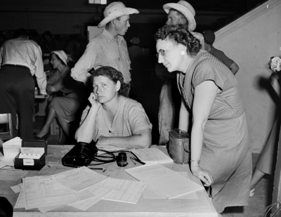 Mrs. Georgia Mae McKee, left, sits despairingly at a Red Cross station in the San Angelo storm area. Her home, car, everything, was lost in the tornado's path. She is applying for Red Cross assistance. With her is her sister Mrs. Dick Harris.