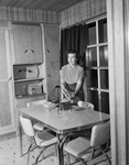 Mrs. W. R. Bagg is shown in the breakfast area of her new home at 4501 Selkirk Dr. Note the chrome furniture in front f a scenic window bamboo wallpaper and built-in cabinets of plywood in natural finish.