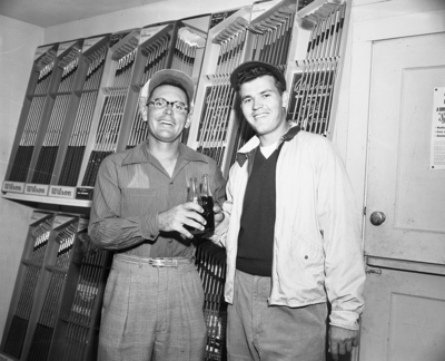 TCU's Graham Mackey (right) leads Southwest Conference golf tournament at Ridglea with 36 holes remaining. He was 70-70 - 140. He is shown enjoying a soda with unidentified man.