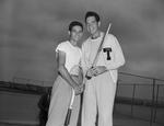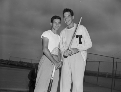 Tom West, right, of the Argricultural and Mechanical College of Texas (Teaxs A&M) offers congratulations to Texas Johnny Hernandez, seeded number 1 in Southwest Conference singles play, after latter advanced to quaterfinals by downing West, 6-2, 6-1, in second round at Texas Christian Univeristy (TCU) courts Thursday.