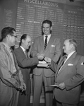 Fort Worth grain firms Thursday recieved, sold and purchased 1953's first carload of Texas wheat. Left to right, Louis Hecker, grain department assistant manager for Transit Grain Company, seller of the consigment of wheat; Harry Hitch, Uhlmann Elevators Company Texas, the buyer; Ben Ferguson, Brackett Grain Company auctioner, and Julian Scott, grain department manager for Transit.