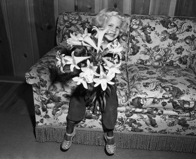 Linda Carol Bliss is sitting on a sofa and holding bunch of lilies with a smile.