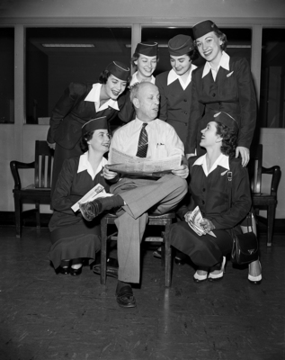 Grif's Heaven - A. J. (Bert) Griffith from Colleyville, poses with Braniff Airways hostesses who recently served coffee on the third floor as a publicity maneuver.