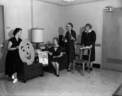 Pictured with some props to be used at a dance Oct. 25 are Mrs. K. B. Roberson , 3005 Primrose , with the harvest moon which will be the theme of the dance ; Mrs. Dennis Hall , 1415 N. Riverside Dr., with a candle-decorated bottle; Mrs. Bernandine Ellis , 3908 Dexter, standing, with a pair of the ornamental bottles , and Mrs. H. E. Aldrich, 4700 Lafayette right.