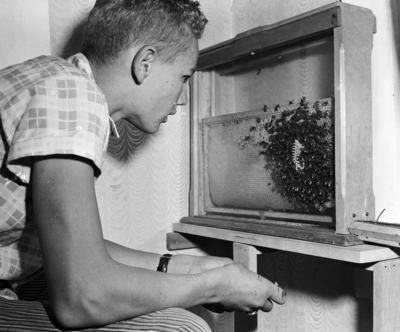 This observation hive which John owns is a source of interest and valuable information about the little honey gatherers.