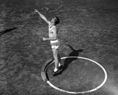 John Morton, Texas Christian University sophomore shot-putter, caught here throwing a shot put. Published in Fort Worth Star-Telegram morning edition April 23, 1950.