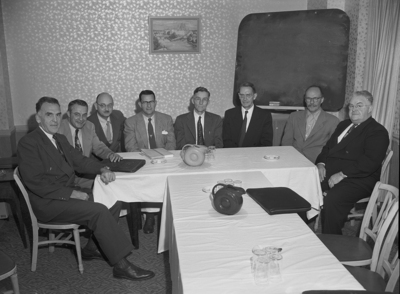 The faculty representatives who compose the governing body of Southwest conference athletics gather with executive Secretary Howard Grubbs for first session at Hotel Texas. Left to right, are Doctor Henry Hardt, Texas Christian University (TCU); Grubbs; Doctor E. D. Mouzon Junior, Southern Methodist University (SMU); W. L. Penberthy, Texas A&M; President Doctor J. D. Bragg, Baylor; Dr. W. E. Bray, Rice; Gus Hodges, Texas, and Doctor Delbert Swratz, Arkansas.