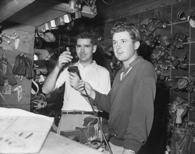 Bill Reid, left, assistant Colonial pro, helps El Paso's Fred Hawkins repair a club after rain cancelled Hawkin's test tour of course Saturday. Fred's early arrival for $25,000 National Invitation starting with Wednesday clinic.
