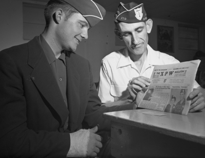 Hospital Corpsman Thomas H. Waddill, left, recently freed from Communist prisoner of war camp, wears the cap he recieved Sunday as the newest member of the Longhorn chapter, American Ex-Prisoners of War. He discusses the organization's newspaper with Commander Vernon K. Rawlings.