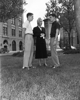 Mrs. Edward R. Hudson and her two sons- Bill, left, and Edward Jr.- chat at John Peter Smith Triangle, site of the monument erected in the memory of their distinguished ancestor. The triangle was the first stop of the Tarrant County Historical Society's tour of significant landmarks.