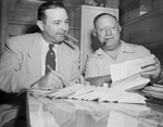 Papers on the cars to be sold Tuesday night at an auction to benefit Greater Fort Worth Hospital Fund are in order, report two members of Independent Automobile Dealers Association. Left is J. F. Faulk, with Bennie Goldstein.