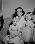 Mrs. James R. Mercer Jr. and her children Jim and Betty. They are sitting on the sofa and smiling for a picture.