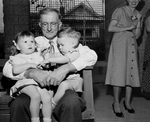 Mr. C. W. Durham is shown sitting with the young Linda Suller and Charles Dickie Oliver sitting on his lap. The photo was taken at a surprise party held for Mr. Durham's 69th birthday. Linda Suller, 2 years old, is the daughter of family friends Mr. and Mrs. Lynn Fuller, of 3719 Calmont. Charlies Dickie Oliver, 15 months old, is the son of Mr. and Mrs. C. L. Oliver, of Mineral Wells. Two unidentified women can be seen standing in the background to the right of the image. Published in the morning edition on April 24, 1950.
